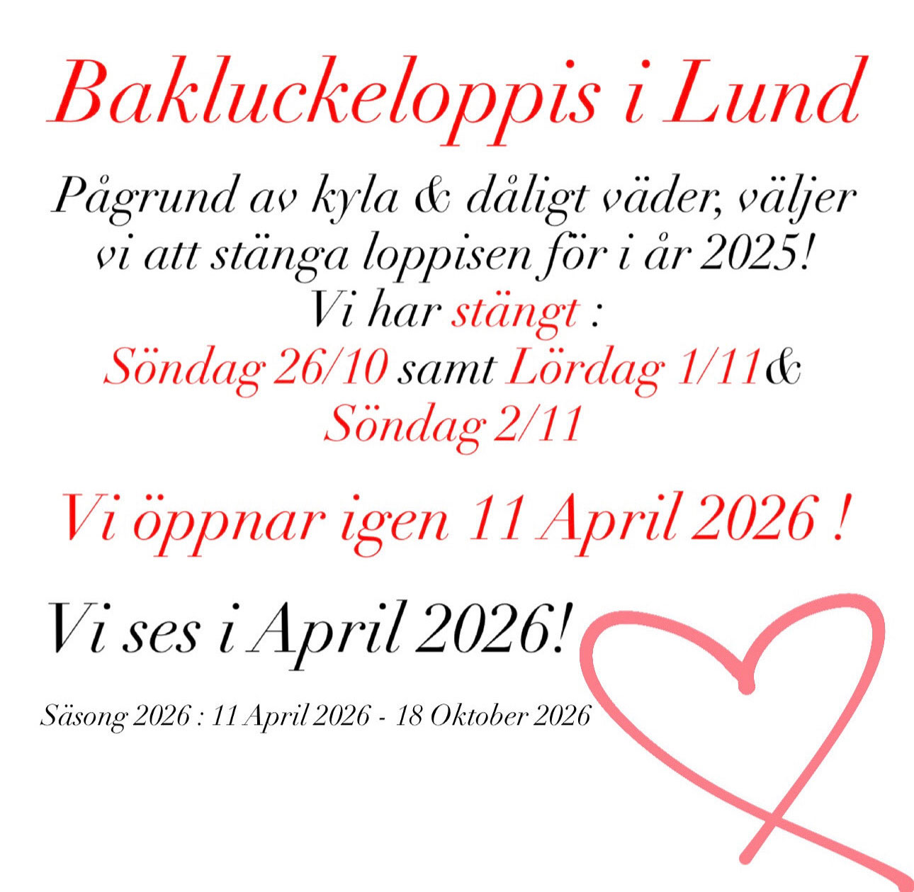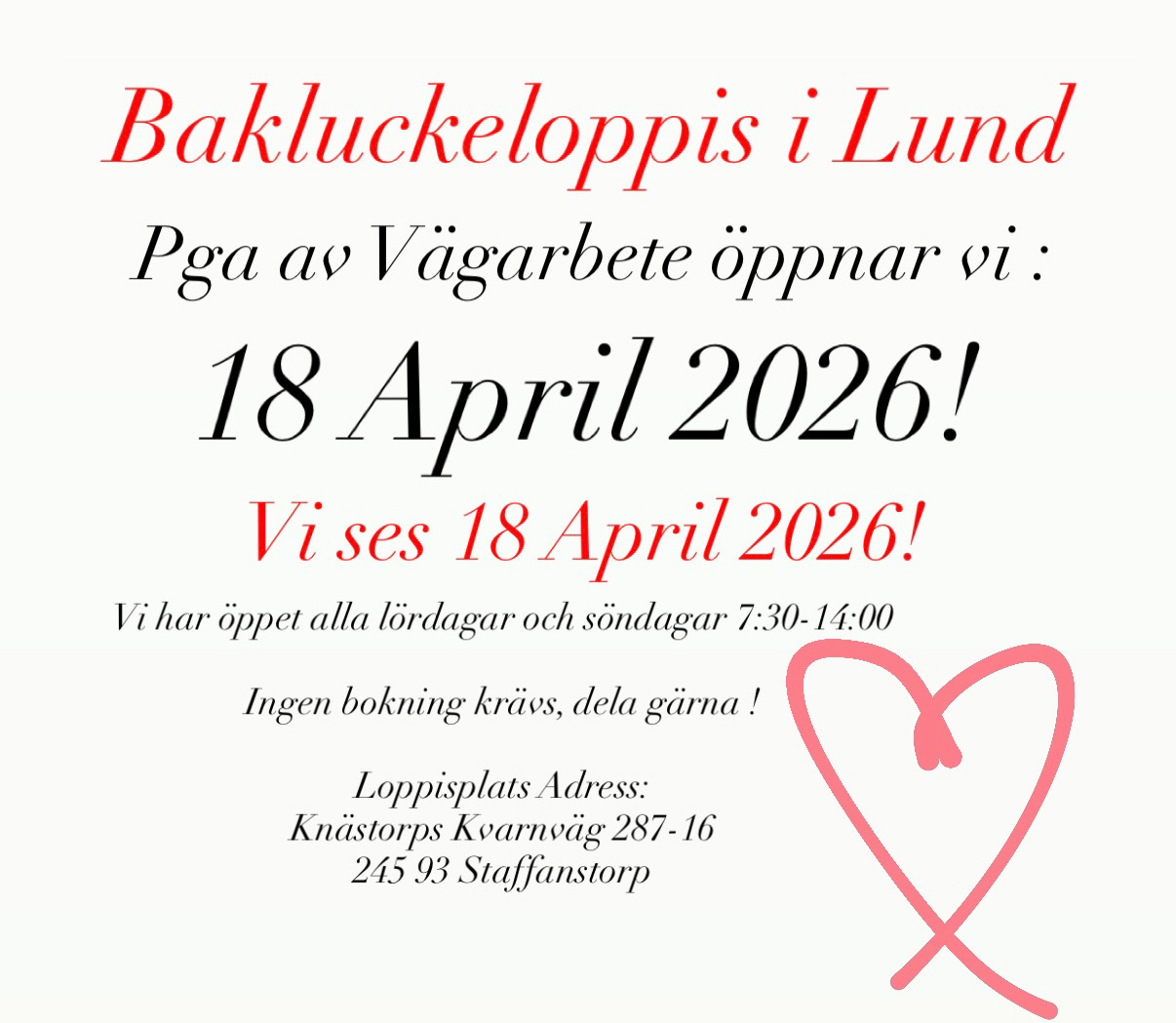 Drive-in Loppis betyder att man kan komma och gå när man vill under dagen, säljare rekommenderas att komma mellan 6-7.Besök vår Instagram för aktuell information och extra öppettider: @bakluckeloppis_lund